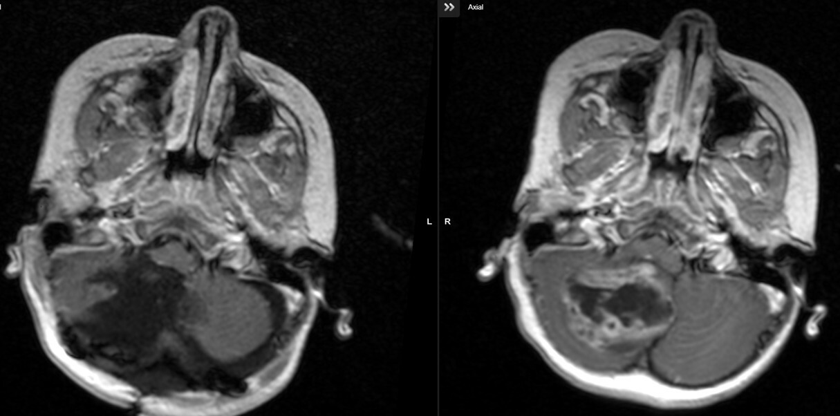 Η μετεγχειρητική MRI επιβεβαίωσε την πλήρη αφαίρεση του όγκου χωρίς υπολειμματική νόσο. Η ιστοπαθολογική εξέταση ανέδειξε πυλοκυτταρικό αστροκύττωμα (WHO Grade 1). Η πρόγνωση της ασθενούς κρίνεται εξαιρετική, με την πλήρη ίαση να είναι ο αναμενόμενος στόχος.