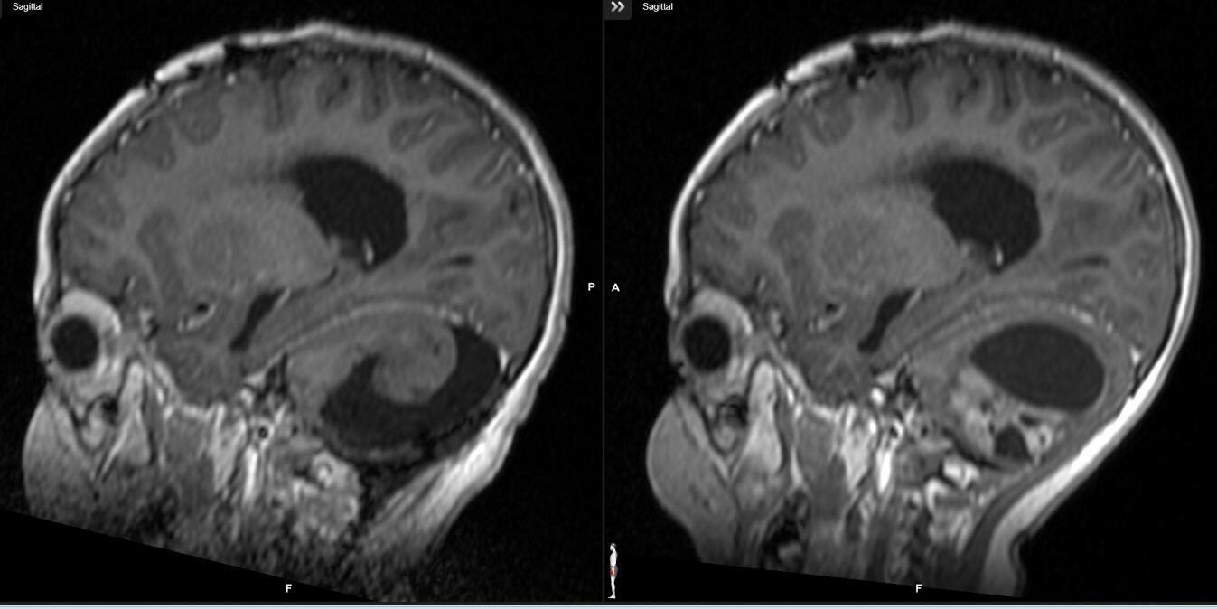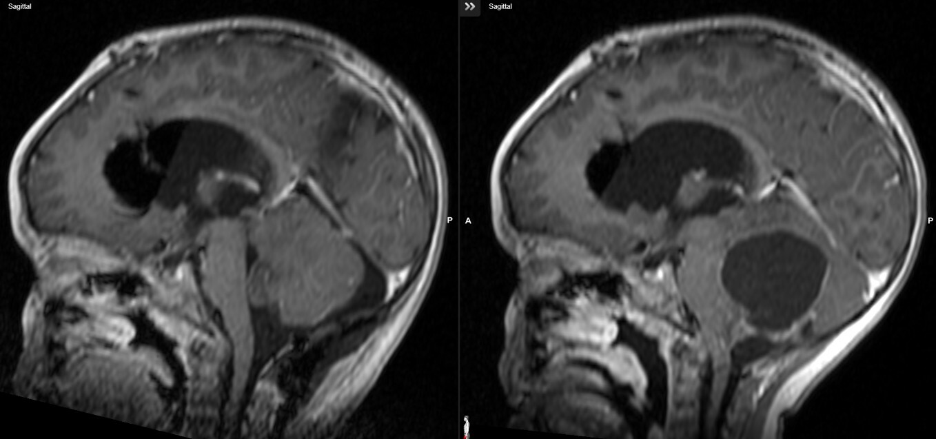 - Επείγουσα Επεμβατική Φάση: Πραγματοποιήθηκε ενδοσκοπική τρίτη κοιλιοστομία (ETV) για την άμεση αποσυμφόρηση του υδροκεφάλου και τη ρύθμιση της ενδοκράνιας πίεσης.