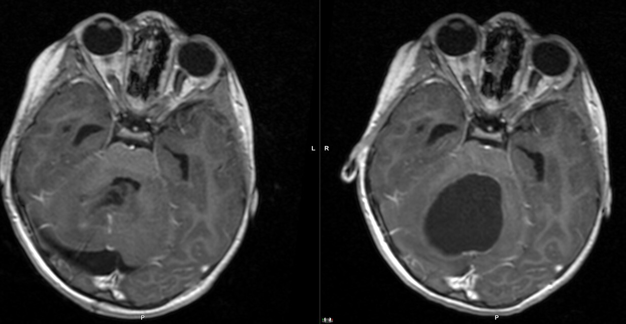 Η ασθενής υποβλήθηκε σε MRI εγκεφάλου, η οποία αποκάλυψε:
